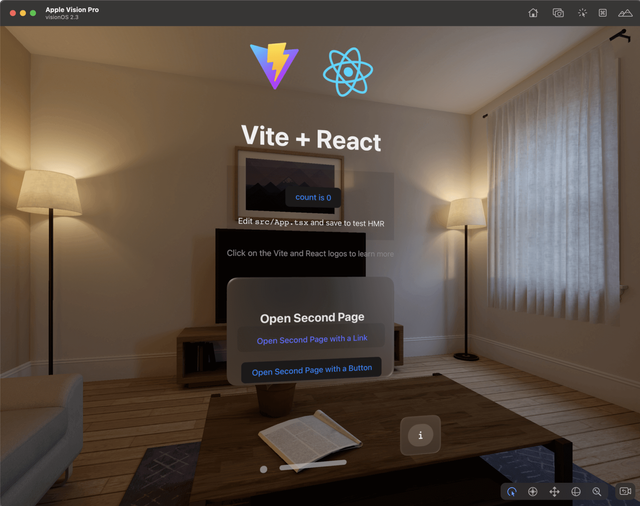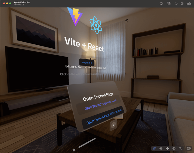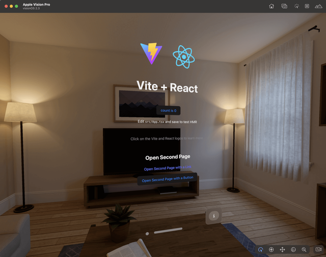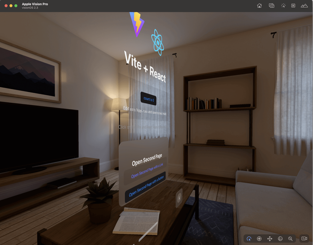 The visionOS simulator will automatically launch, installs the Packaged WebSpatial App, and runs it:
